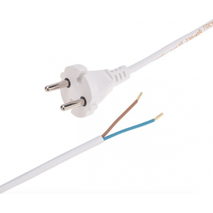 Провод ПВС сечением 2х0,75 мм² номинальным током 10 А с подготовленными (зачищенными) контактами укомплектован литой неразборной плоской вилкой (Евро).